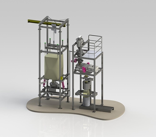 噸袋卸料站是用來實(shí)現(xiàn)袋裝散料的卸料功能,為半自動(dòng)設(shè)備,其工作原理及操作流程為:
